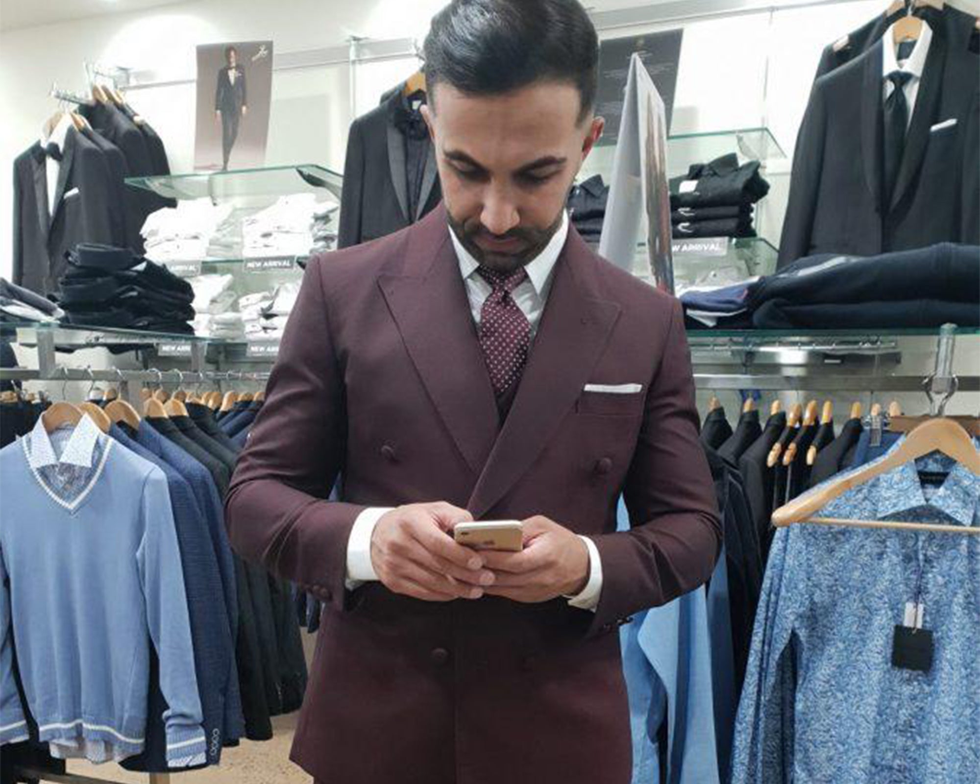 Ali picking up his Franckino Sartoria bespoke creation. He has chosen a beautiful maroon cloth by Holland & Sherry. If you are looking for bespoke suits for men with a point of difference? Come and talk to us, all our bespoke suits are hand made on the premises in our Liverpool store, by our maestro Francesco.
