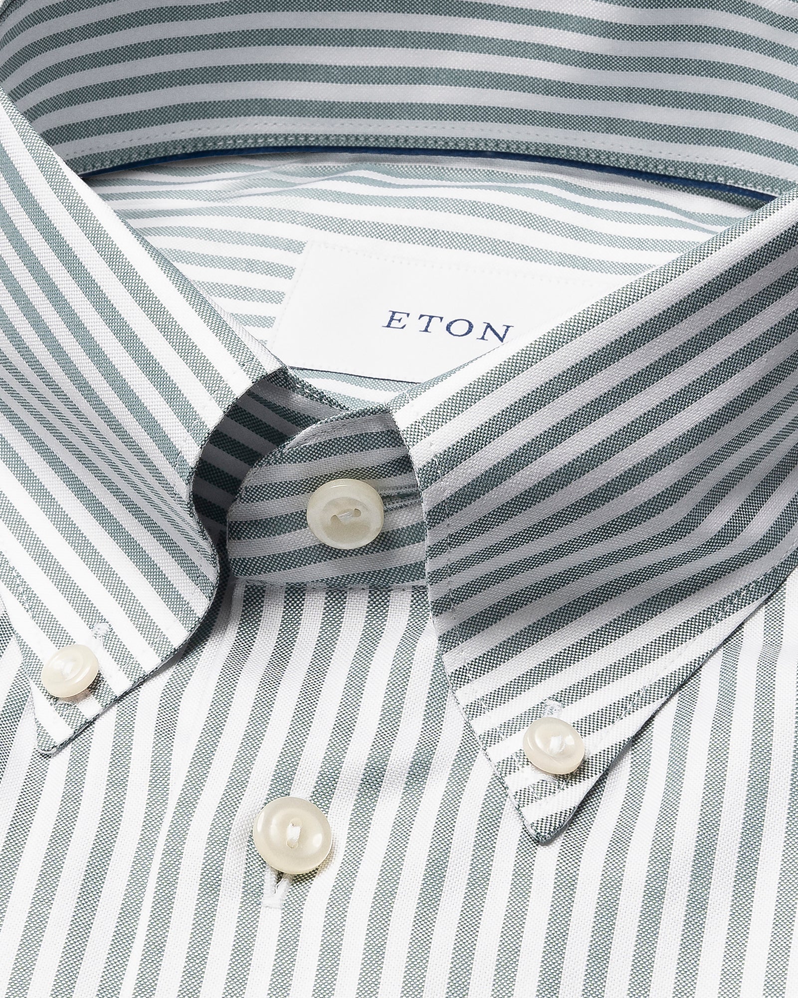 This stylish button-down collar green dress shirt is cut from Eton's fine Twill cloth, a beautiful fabric that offers a featherweight hand and an elegant, diagonal texture. The fabric is woven from 100% cotton mélange yarns into a stripe, with the mélange texture creating a softer palette, in subtle spring colours.