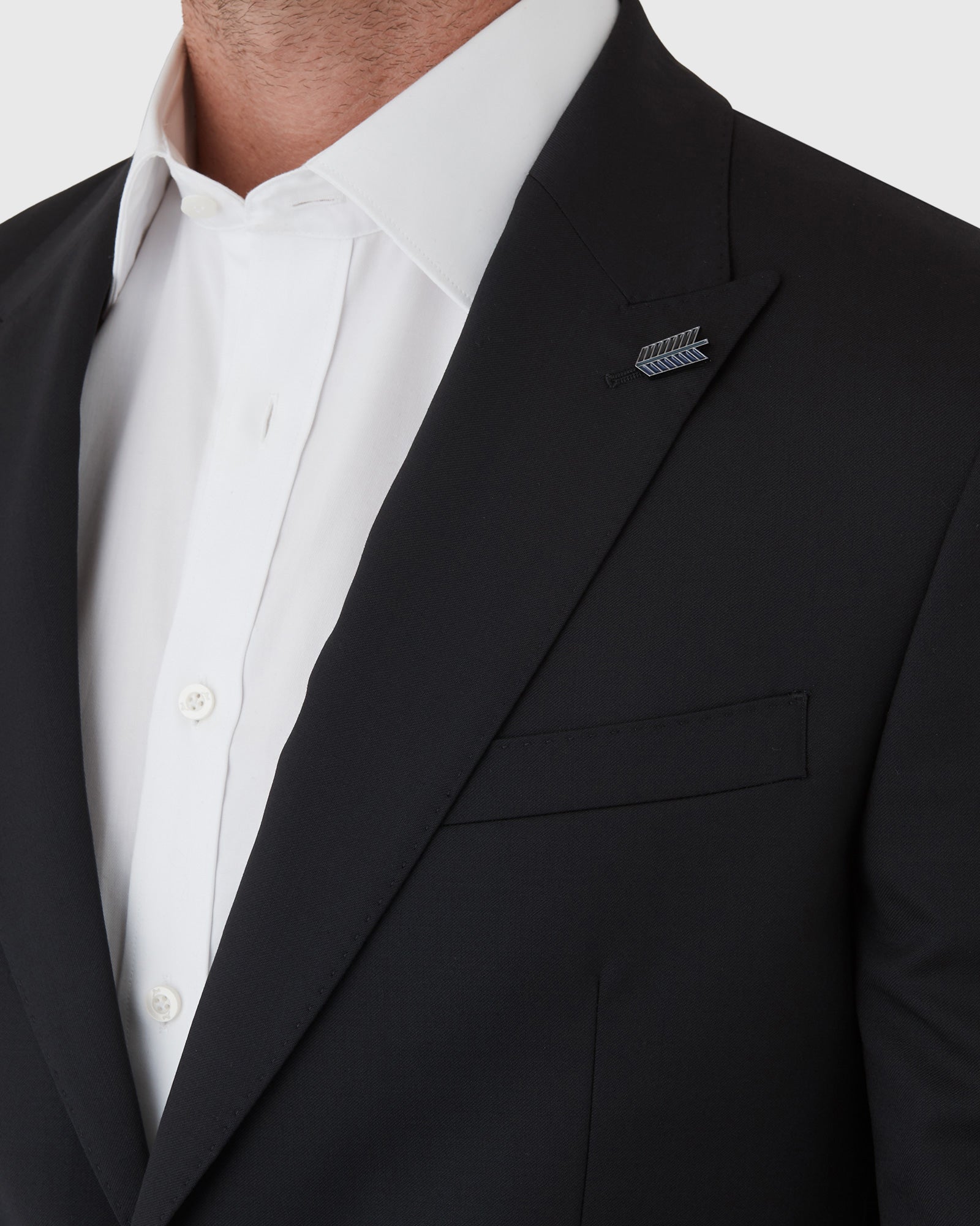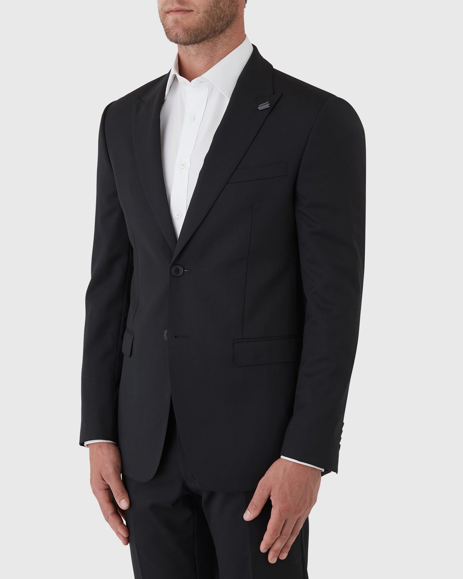 This solid black SB Suit Separate jacket is made with an 85mm peak lapel, it has a straight pocket with flaps, and side vents with overlapping buttons detail on the sleeve, a great all-purpose suit jacket.