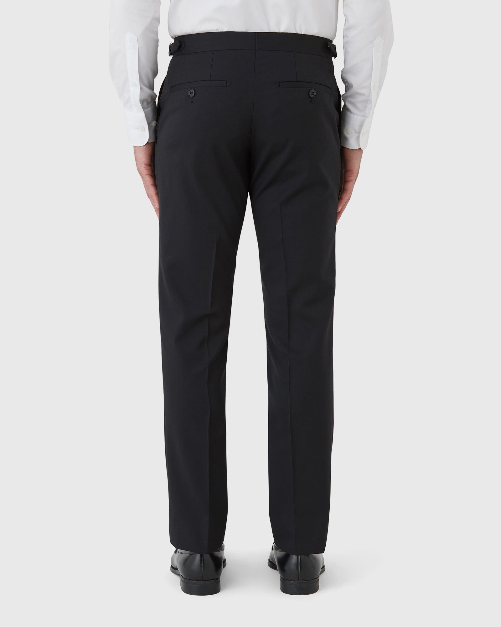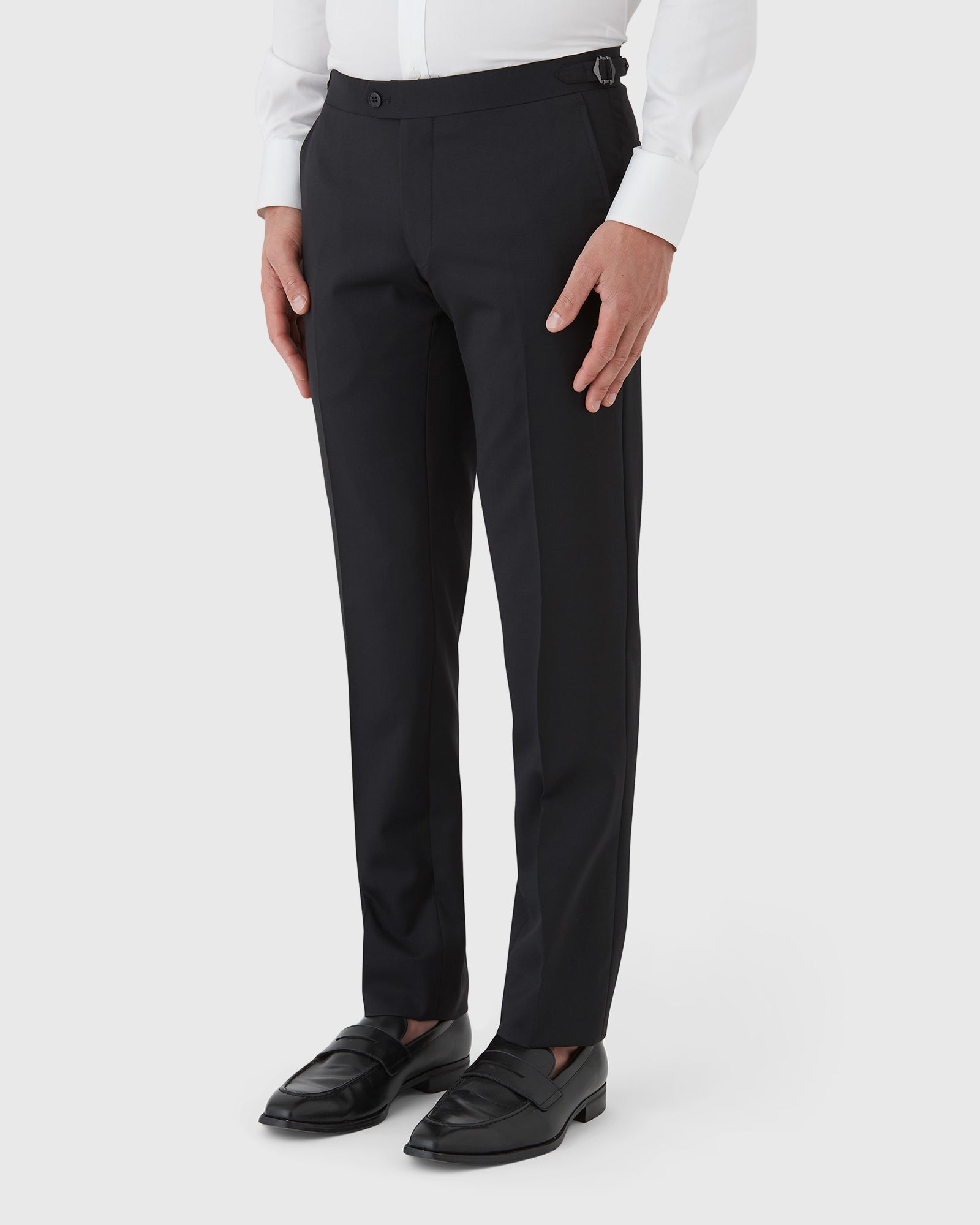 This flat front FMG100 Skyfall black Tuxedo trouser, features two side pockets and two hip pockets with buckle side adjusters and no belt loops. Care Tips: Do not dry clean your trouser too often as it causes premature fabric wear & causes the fabric to go shiny after a while. Example: If you wear your trouser 3 times a week don’t dry clean more than 3 or 4 times a year unless it needs it. Ask your dry cleaner to just steam them, or you can air them yourself, on a beautiful dry day put them on a trouser hanger and hang them outside on your clothesline for a few hours to air it, it will do wonders. Please Note: All wool products need moth protection, make sure you change your moth protectors in your wardrobe every few months or per box instruction.