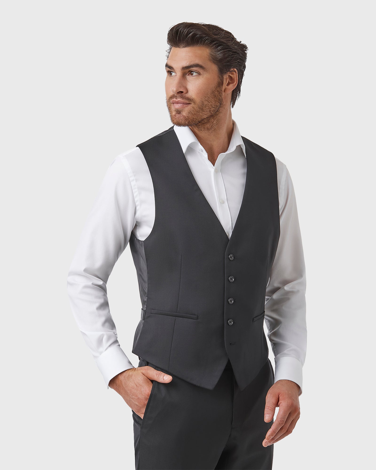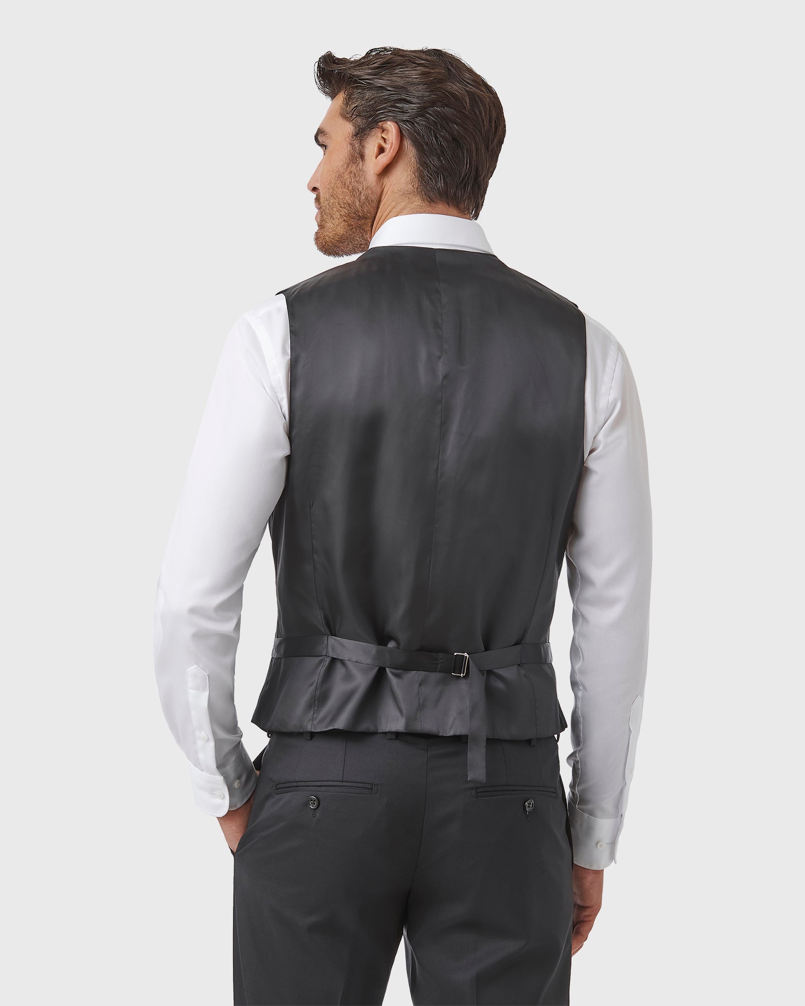 This Beaumont Vest is constructed with 5 front buttons, an angled jet pocket with an adjustable strap at the back, and looks great as a 3-piece suit.
