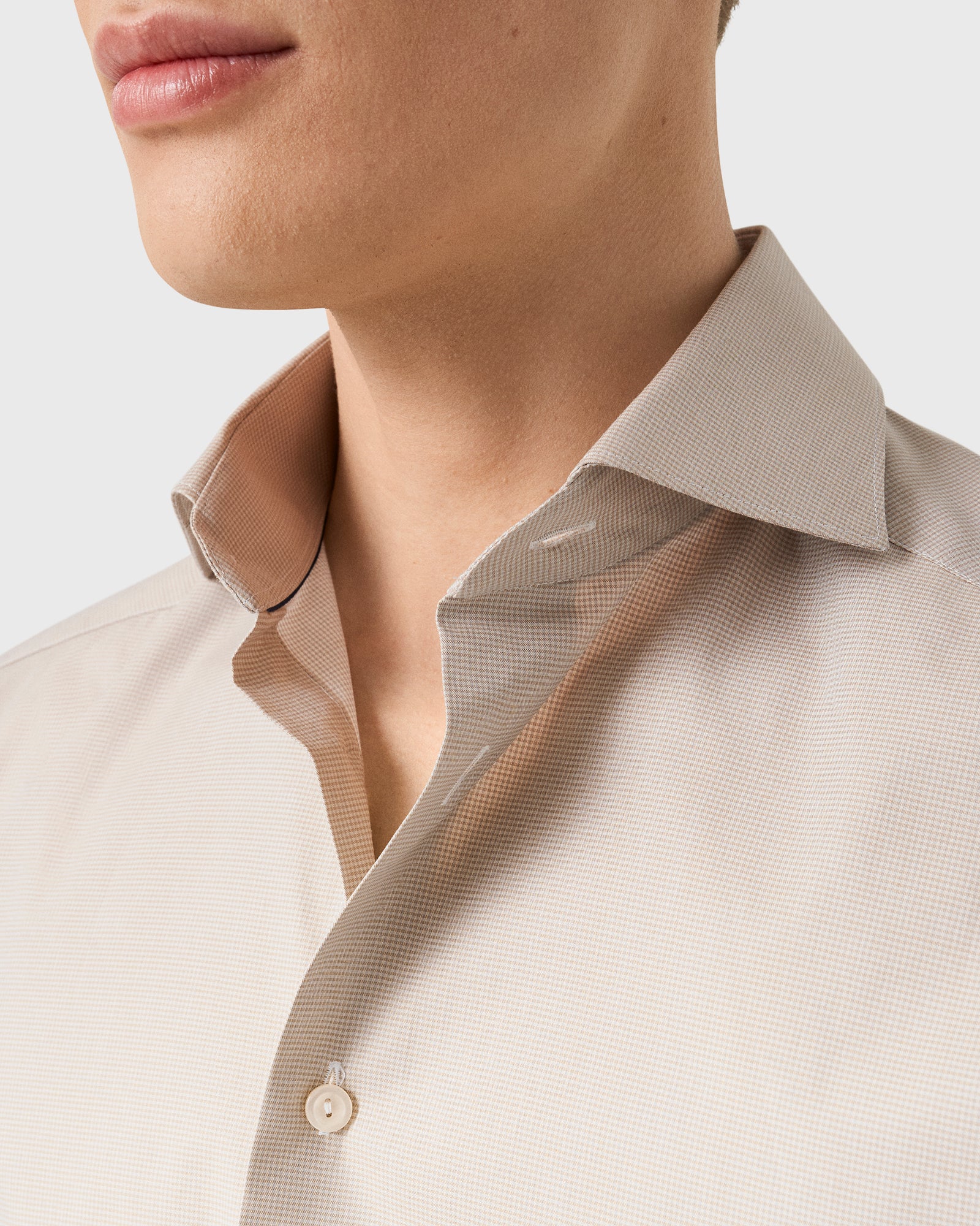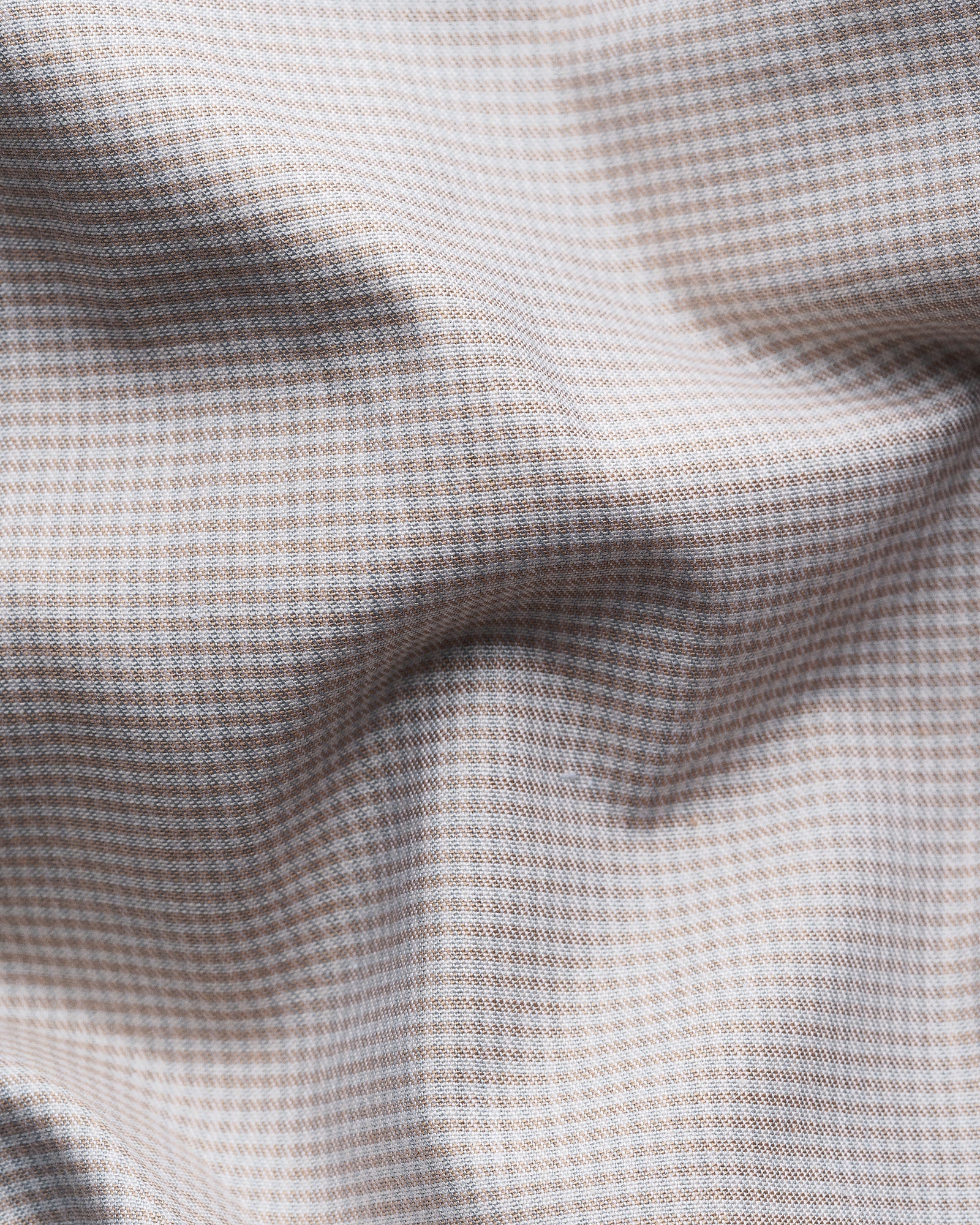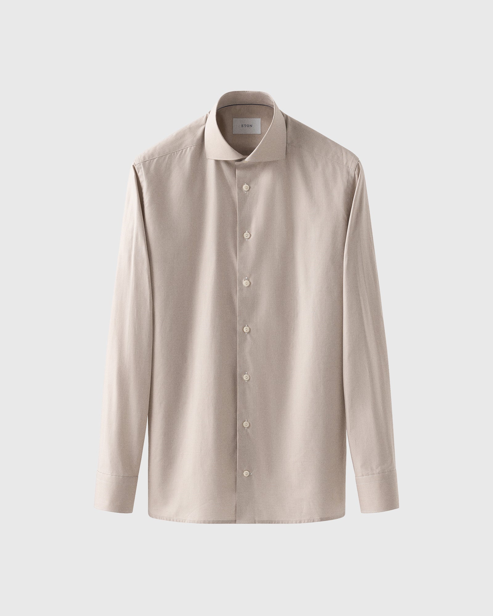 This stylish sand cutaway collar micro check shirt is cut from Eton's fine Twill cloth, a beautiful fabric that offers a featherweight hand and an elegant, diagonal texture. The fabric is woven from 100% cotton mélange yarns into a stripe, with the mélange texture creating a softer palette, in subtle spring colours.